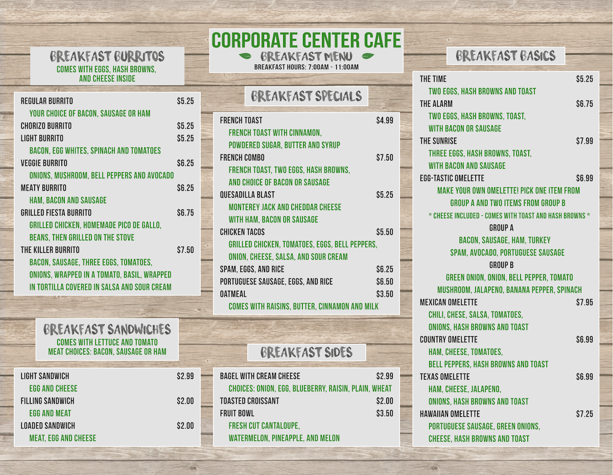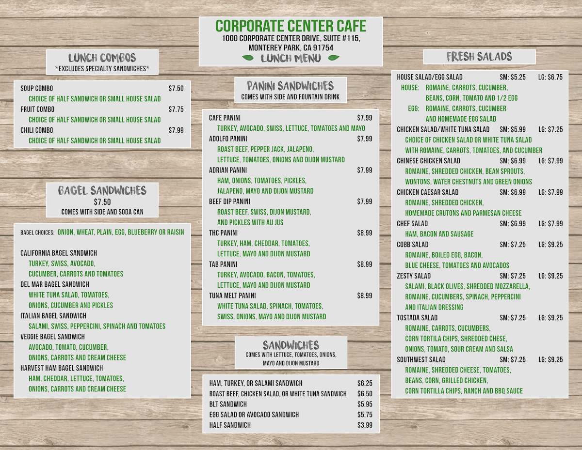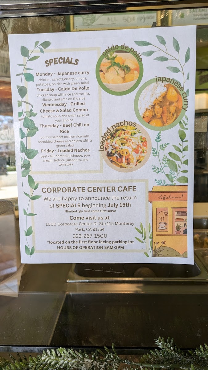 If you're looking for a relaxed spot to enjoy a tasty meal, the Corporate Center Cafe Menu has something to offer for everyone. Nestled at 1000 Corporate Center Dr # 115, Monterey Park, CA, this cafe is a go-to place for quick bites or a satisfying lunch break. From delicious sandwiches, wraps, and fresh salads to warm bowls, there's a dish to satisfy your cravings. Each item on the menu is thoughtfully crafted to deliver both flavor and freshness, whether you're in the mood for a light snack or a more filling meal. With options that cater to different tastes and preferences, you're sure to find something that hits the spot every time. The cafe’s laid-back atmosphere makes it a perfect spot for casual dining with friends or a peaceful lunch during a busy workday.